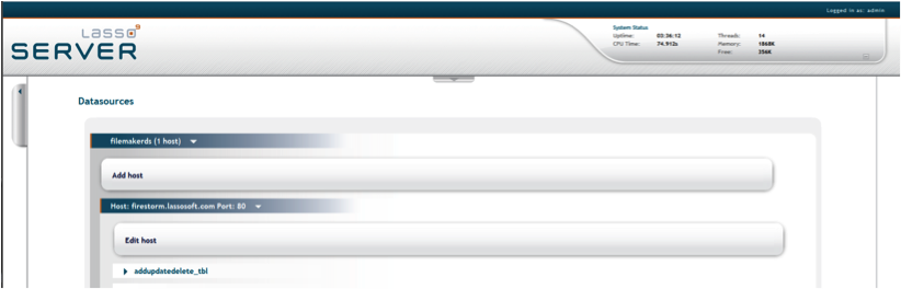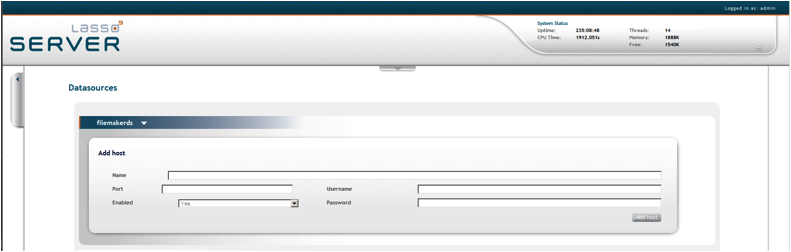 The Datasources page in Lasso Administration displays all data source connectors available in Lasso, and allows the administrator to add new hosts. A host is a computer that serves the databases with which Lasso Server communicates.