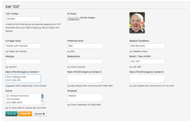 The process of adding *ICE*/Emergency information is guided by a form that includes typical information users may want to make available, but users can add any information they wish. Each piece of information added to an *ICE* Profile is highly encrypted for storage in the QR2id database (1024 bit). This ensures that the data remains protected and cannot be accidentally exposed to an unauthorised party.