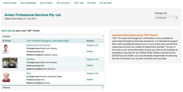 *ICE* Profiles can be attached to any QR2id Codes in the user's account. A shared QR2id Code, such as on a key ring, can have multiple *ICE* Profiles attached. When a QR2id Code is scanned and there is an associated *ICE* Profile, a message to emergency services is displayed with a link to a simple form to retrieve the *ICE* Profile information.