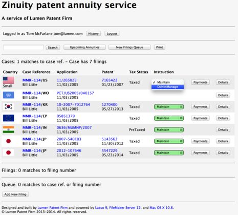 -Results of searching for a family of related patents, showing their current status, and allowing change in instruction for annuity management.