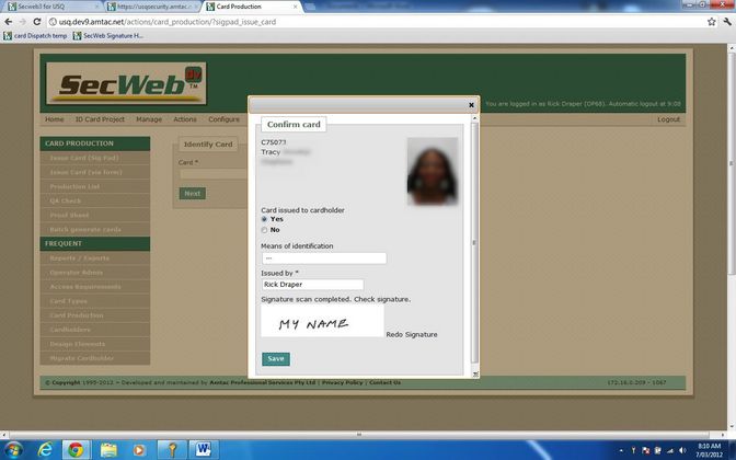 Data from a Contactless Smart Card is scanned into a field on a web form, which when submitted brings up an image of the ID Cardholder in a web page dialogue and triggers a JSONP call to a workstation based web-service that triggers a USB connected digital signature pad. The Cardholder acknowledges the message display on the signature pad LCD and signs for the card. JSONP interaction between the Lasso driven web page and the workstation based web-service presents the signature in the dialogue. The signature is confirmed by clicking the save button on the dialogue and then is submitted in a multipart form for Lasso processing and storage in the applicable database. Viewing details of an issued card shows the signature.